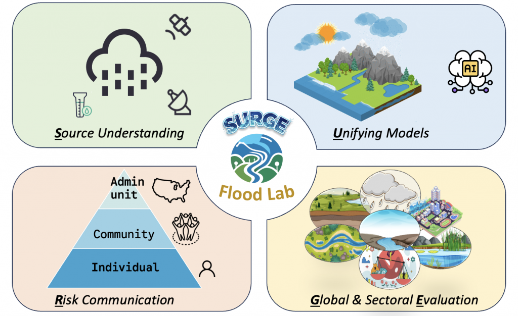 my research agenda advances under the SURGE Flood Lab framework: Source Understanding diagnoses atmospheric contributions to flood-producing storms using multi-source data from remote sensing, in-situ measurements, and warning messages; Unifying Models integrates physical hydrologic-hydraulic (H&H) models with AI for rapid, interpretable flood computations; Risk Communication adopts a bottom-up approach, tailoring warnings to individual profiles for equitable dissemination; and Global & Sectoral Evaluation assesses cross-sectoral impacts holistically. Central to this is launching the Flood-Agriculture-Climate-Ecology-Diseases (FACED) Collaboratory.